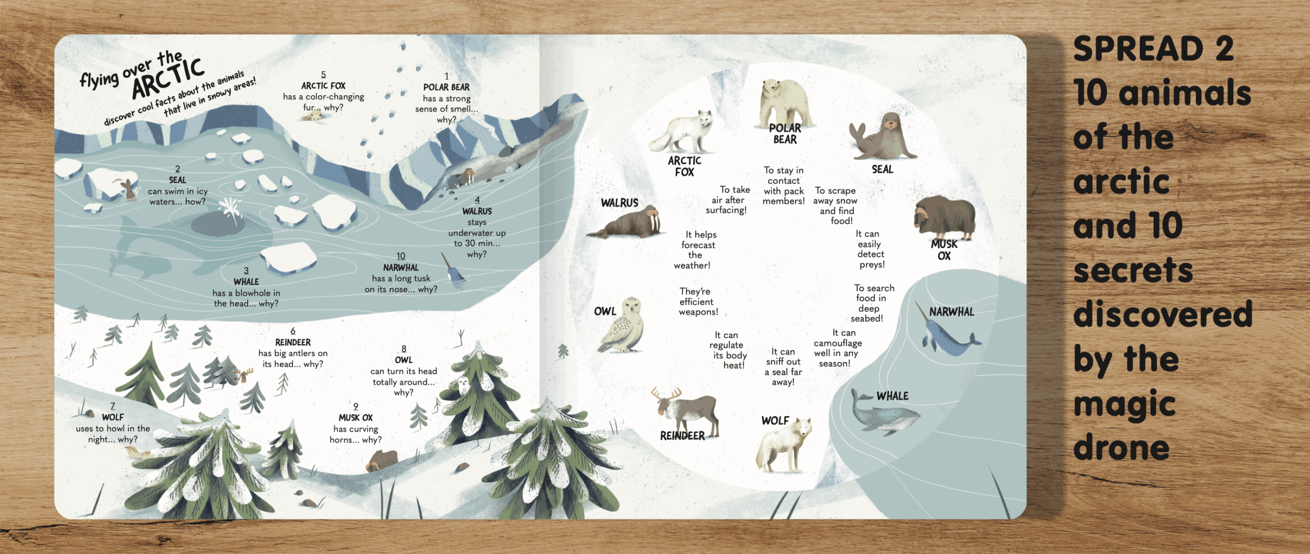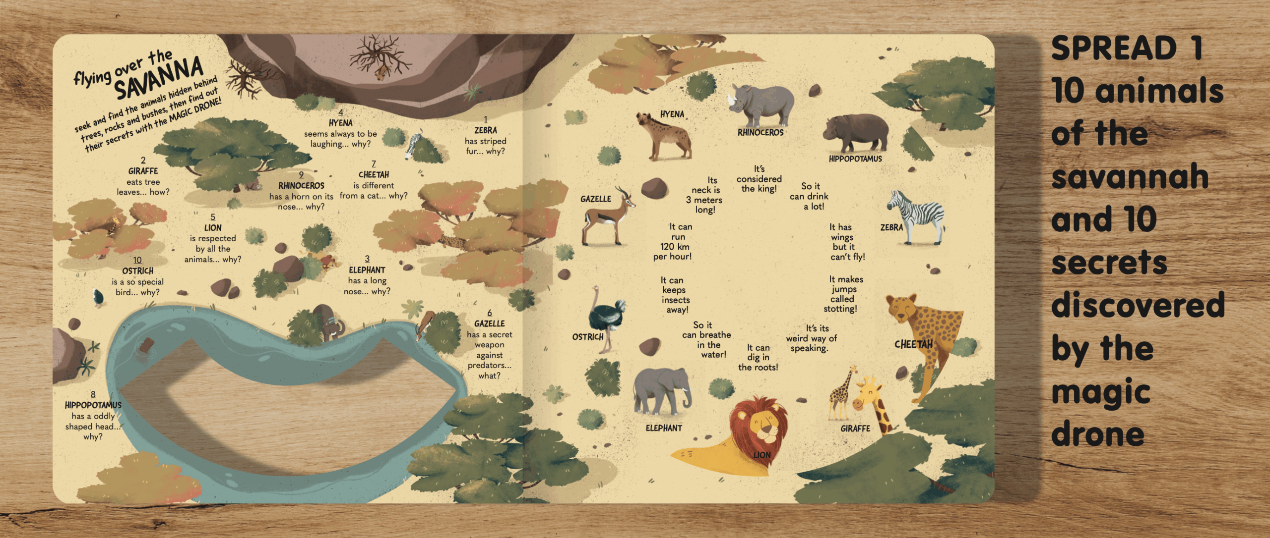 By rotating the incredible big discs the little reader can make the magic drones actually fly in order to find out all the secrets about animals.